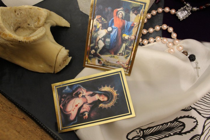 When women come back is a piece first developed inside the exhibition To Be Born By Weaving (2015). The piece is developed as an intervention of an device of popular use in catholic populations: Mariam Holy Cards. The work borns from a research on how heavily modern and contemporary Western Art privilege visual art over other senses as a logical consequence of centuries of iconophile in Catholic Europe. By altering a device of popular use to integrate feminist content in a subtle way, the artist transgress political aspects of the imagery without fetishizing the object.